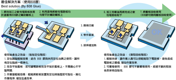 解決軟性電路板 (FPC) 在SMT加工製造上,因其可撓以及薄化之特性,無法像一般硬性電路板可以直接放置在機器軌道上進行加工,必須借助載板以及輔助黏著的工具或設備的使用,來改善其特性所容易造成之加工不易以及零件裝著偏移不準確,而造成良率不高以及製程的工作程序增加,讓生產效率降低而無法提升;本產品808膠其具有耐高溫、可重複使用之特性,可解決上述困擾.